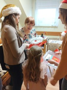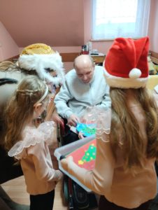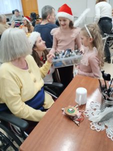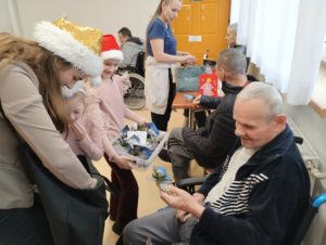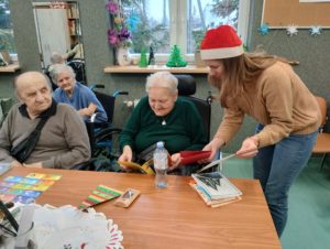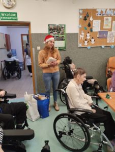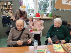 W dniu 23 grudnia 2025 zawitała do mieszkańców DPJ najbardziej im znana wolontariuszka –  pani Małgorzata Kochan wraz z  siostrą Klaudią i jej dziećmi oraz  ich ciocią, „obsypując” seniorów rozmaitymi prezentami od smakołyków począwszy a na materiałach do terapii  zajęciowej skończywszy.