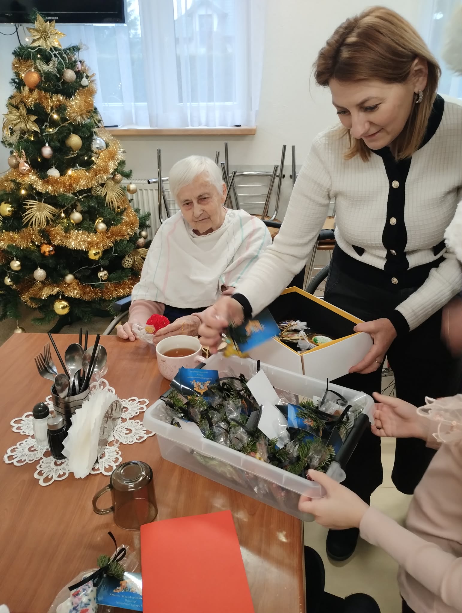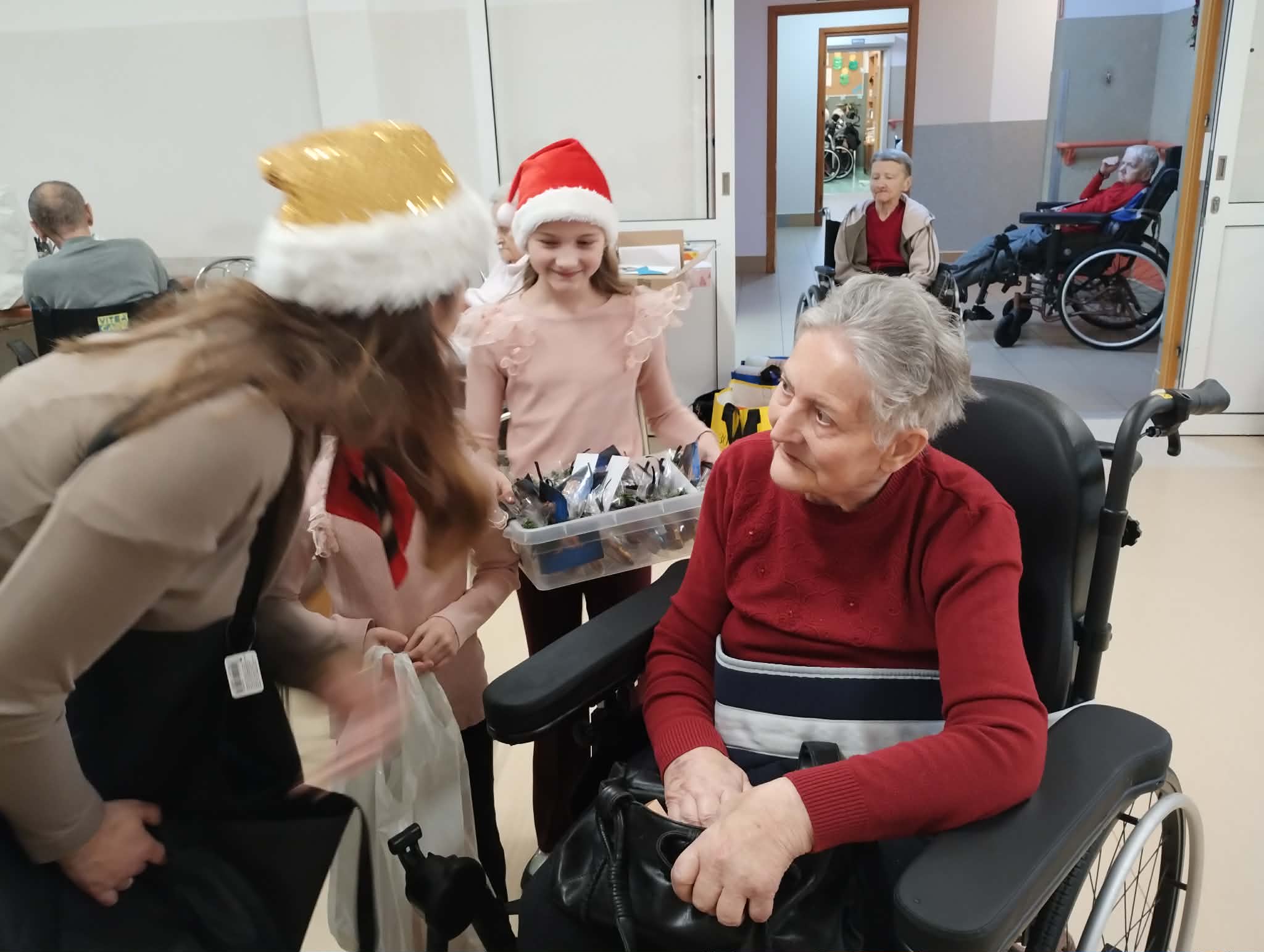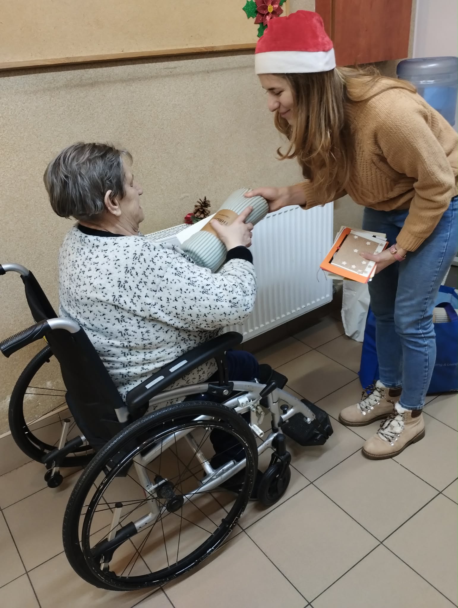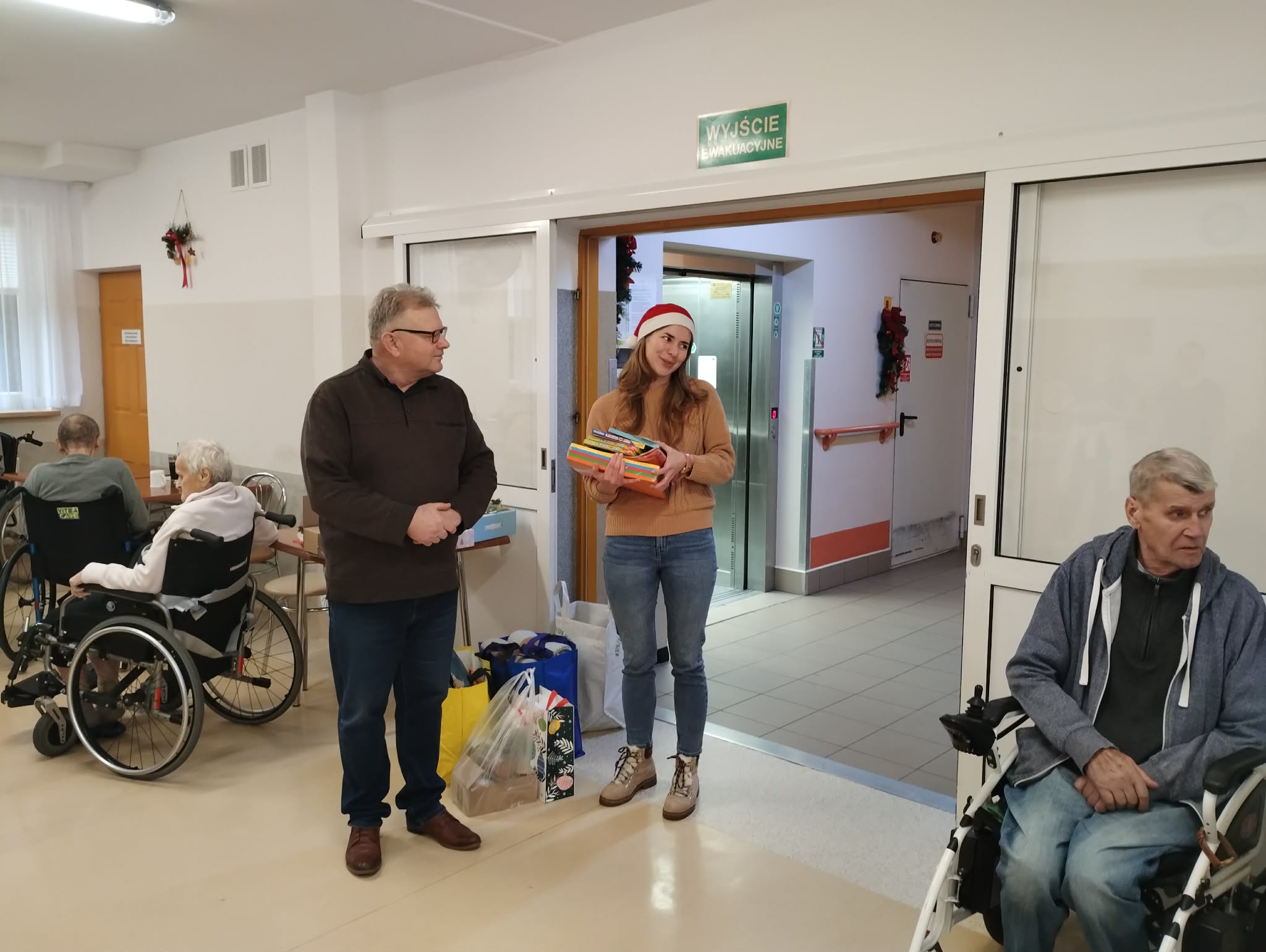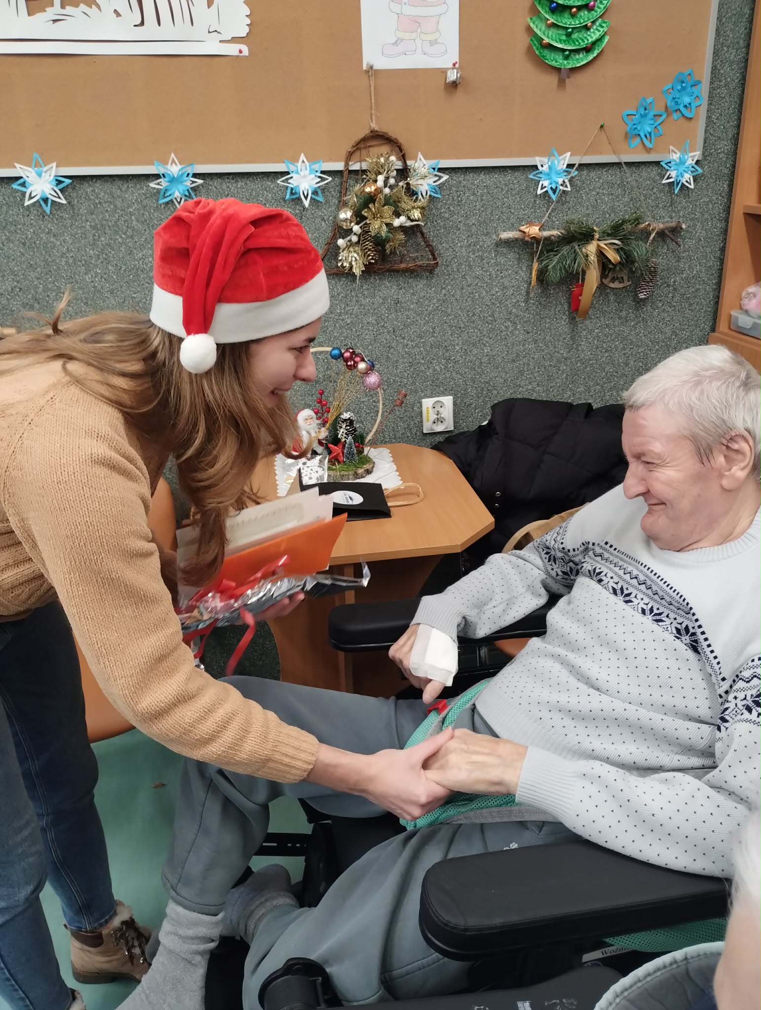 W dniu 23 grudnia 2025 zawitała do mieszkańców DPJ najbardziej im znana wolontariuszka –  pani Małgorzata Kochan wraz z  siostrą Klaudią i jej dziećmi oraz  ich ciocią, „obsypując” seniorów rozmaitymi prezentami od smakołyków począwszy a na materiałach do terapii  zajęciowej skończywszy.