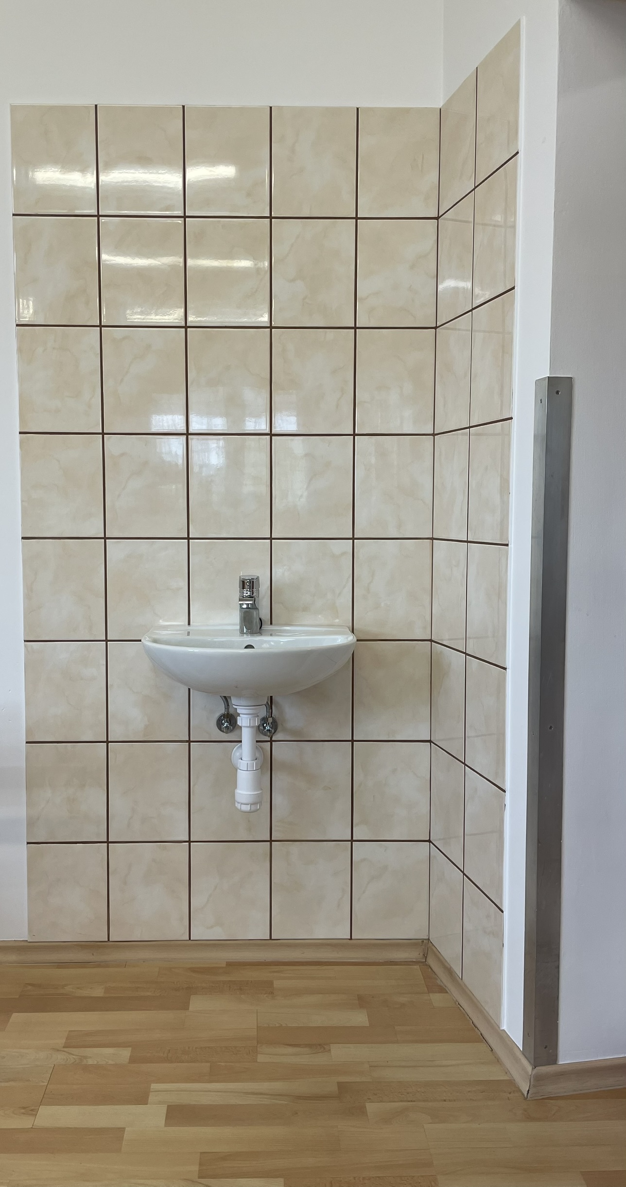 3. Montaż umywalki w sali do ćwiczeń rehabilitacyjnych na I piętrze DPJ i ułożenie płytek  wokół umywalki.