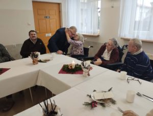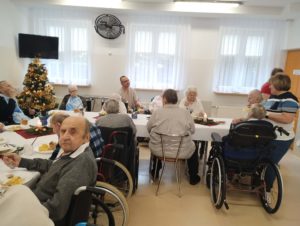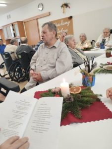 Tradycyjnie rozpoczęliśmy od wspólnej modlitwy i czytaniu fragmentu Pisma Świętego, po czym przystąpiliśmy do łamania się opłatkiem, przekazaniu sobie wzajemnych życzeń i śpiewaniem kolęd. Nie zapomnieliśmy o wszystkich osobach, którym stan zdrowia nie pozwolił uczestniczyć we wspólnej wieczerzy składając im życzenia przy łóżkach.